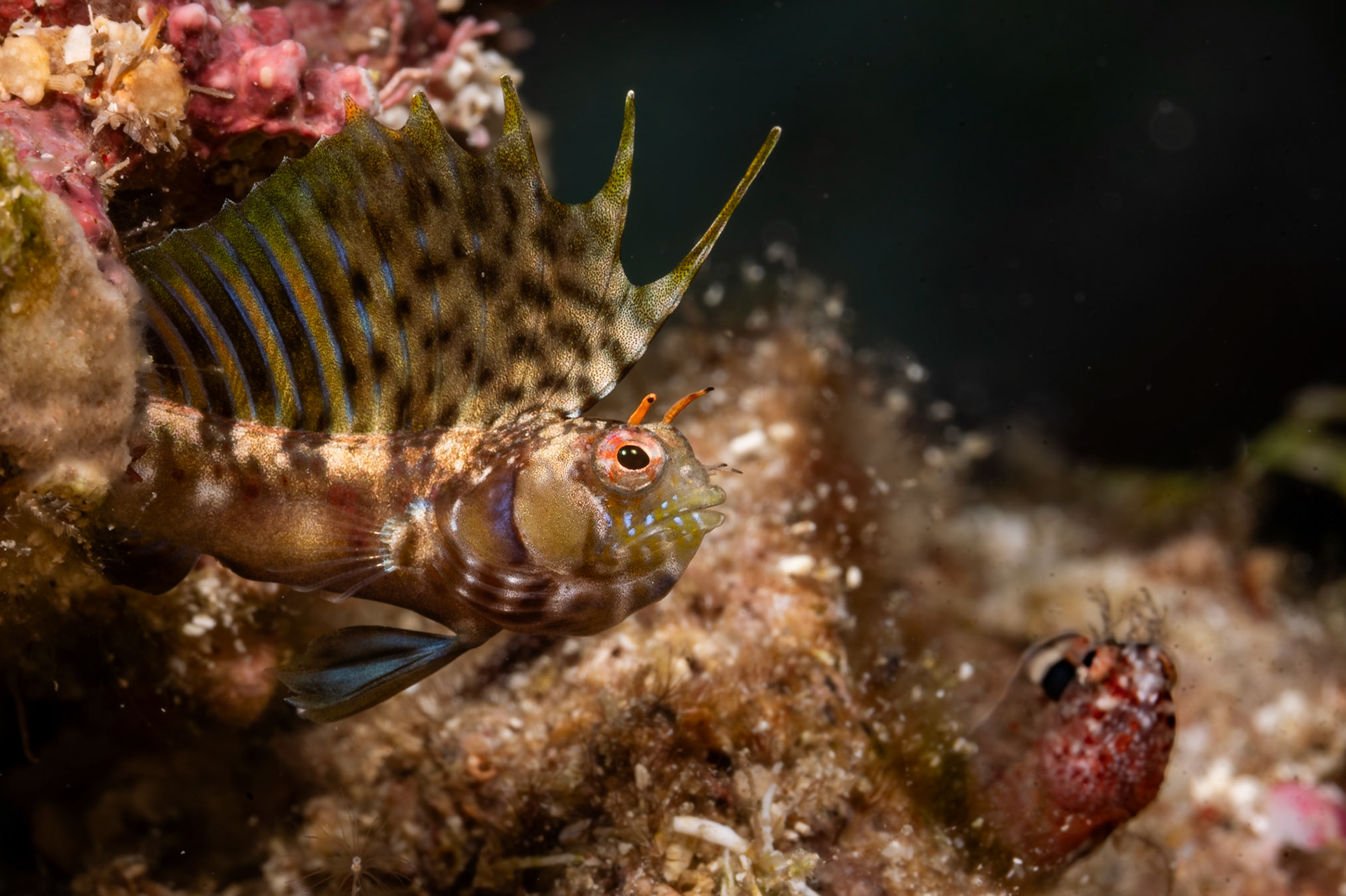 Trash provides sanctuary for this Striped Fangblenny. Pertamina Jetty, Indonesia