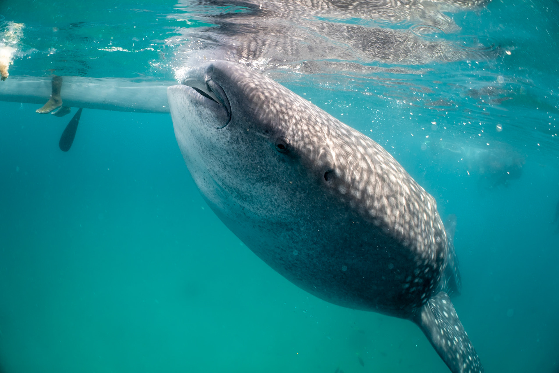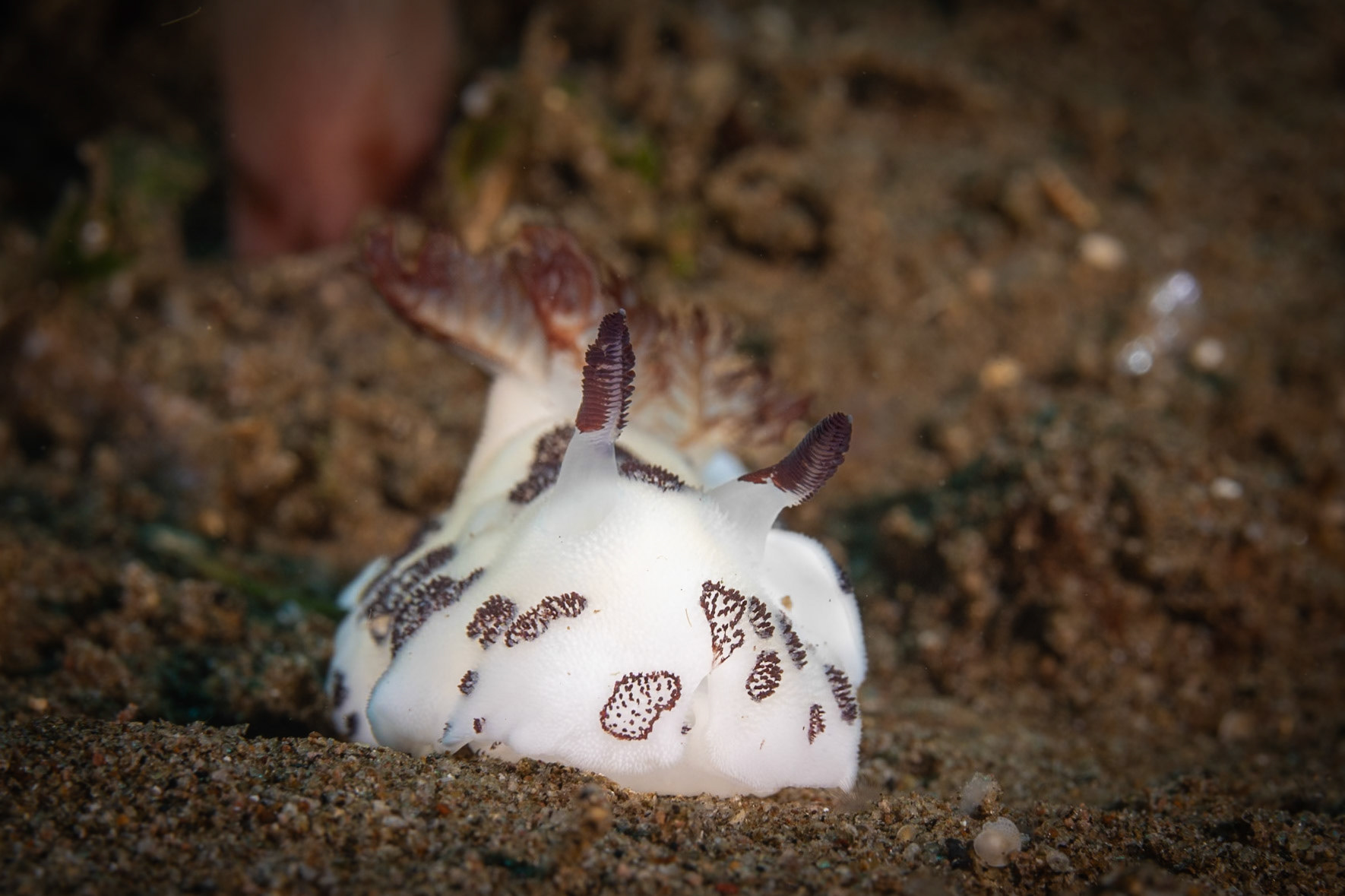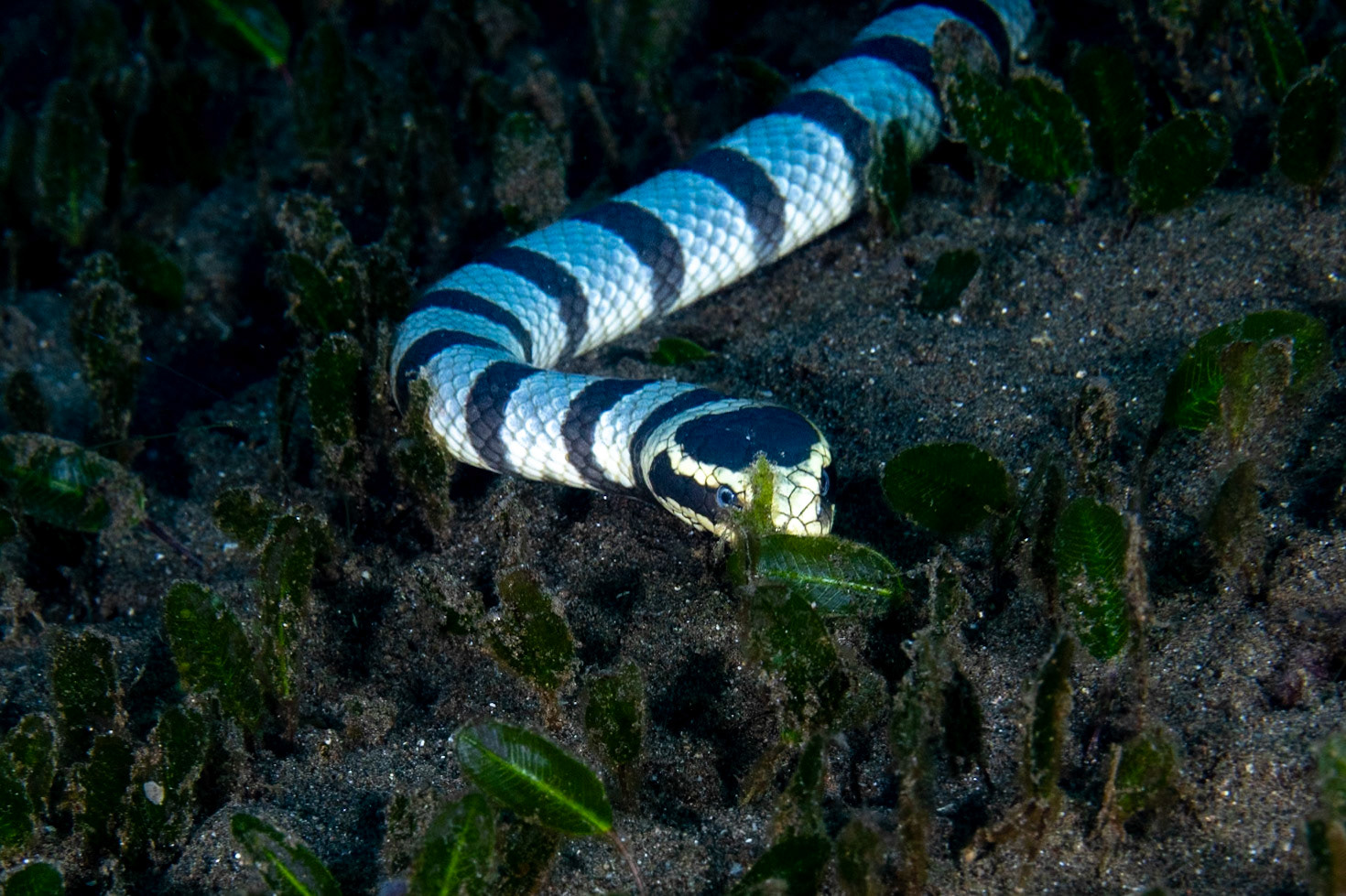 I was lucky to catch the Banded Snake Eel making a pass over the Giant Frogfish. The Frogsish is black with her mouth close to the eel and her eye just above with whire radial lines surrounding.