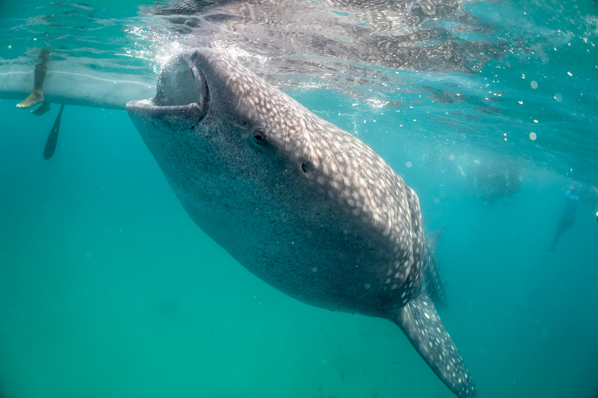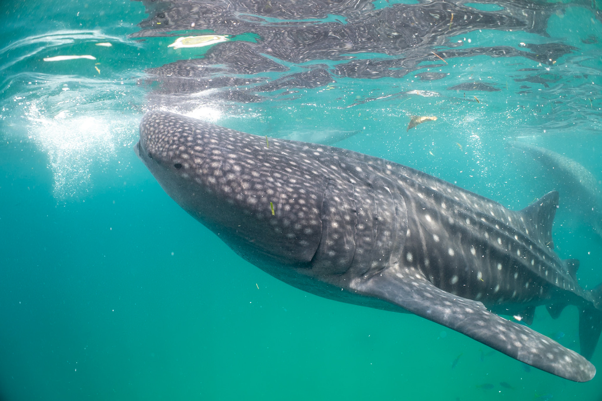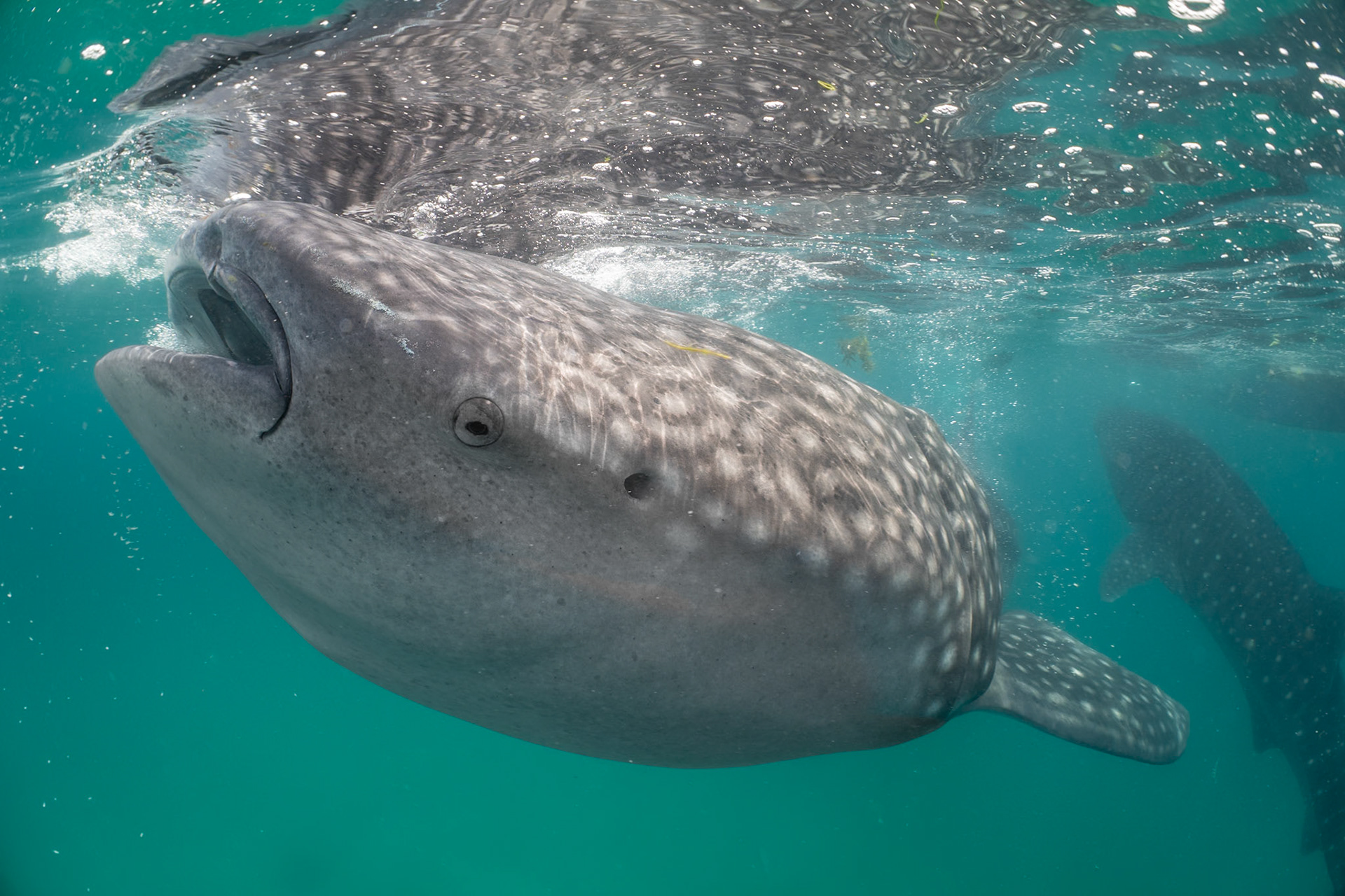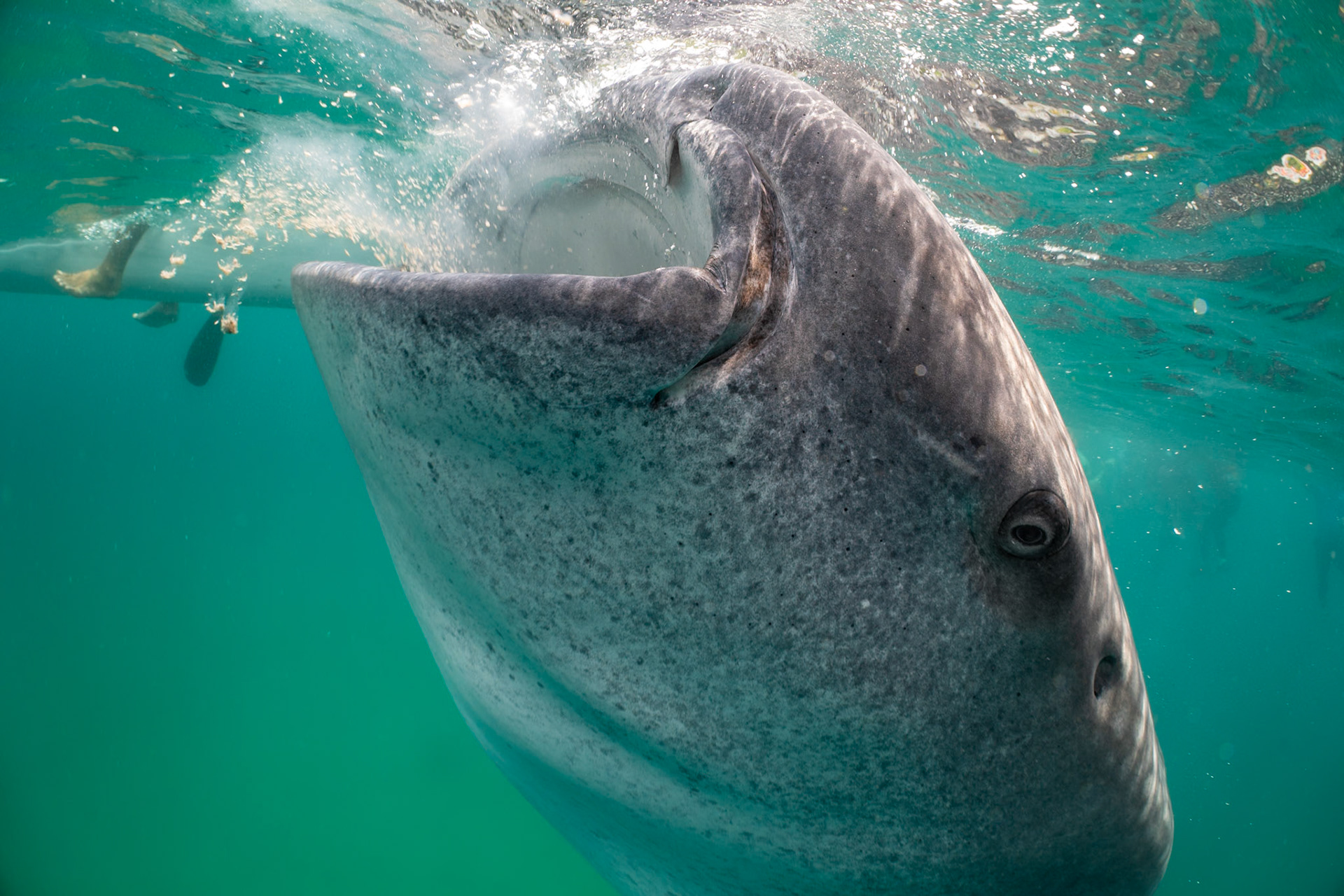 I was lucky to catch the Banded Snake Eel making a pass over the Giant Frogfish. The Frogsish is black with her mouth close to the eel and her eye just above with whire radial lines surrounding.
