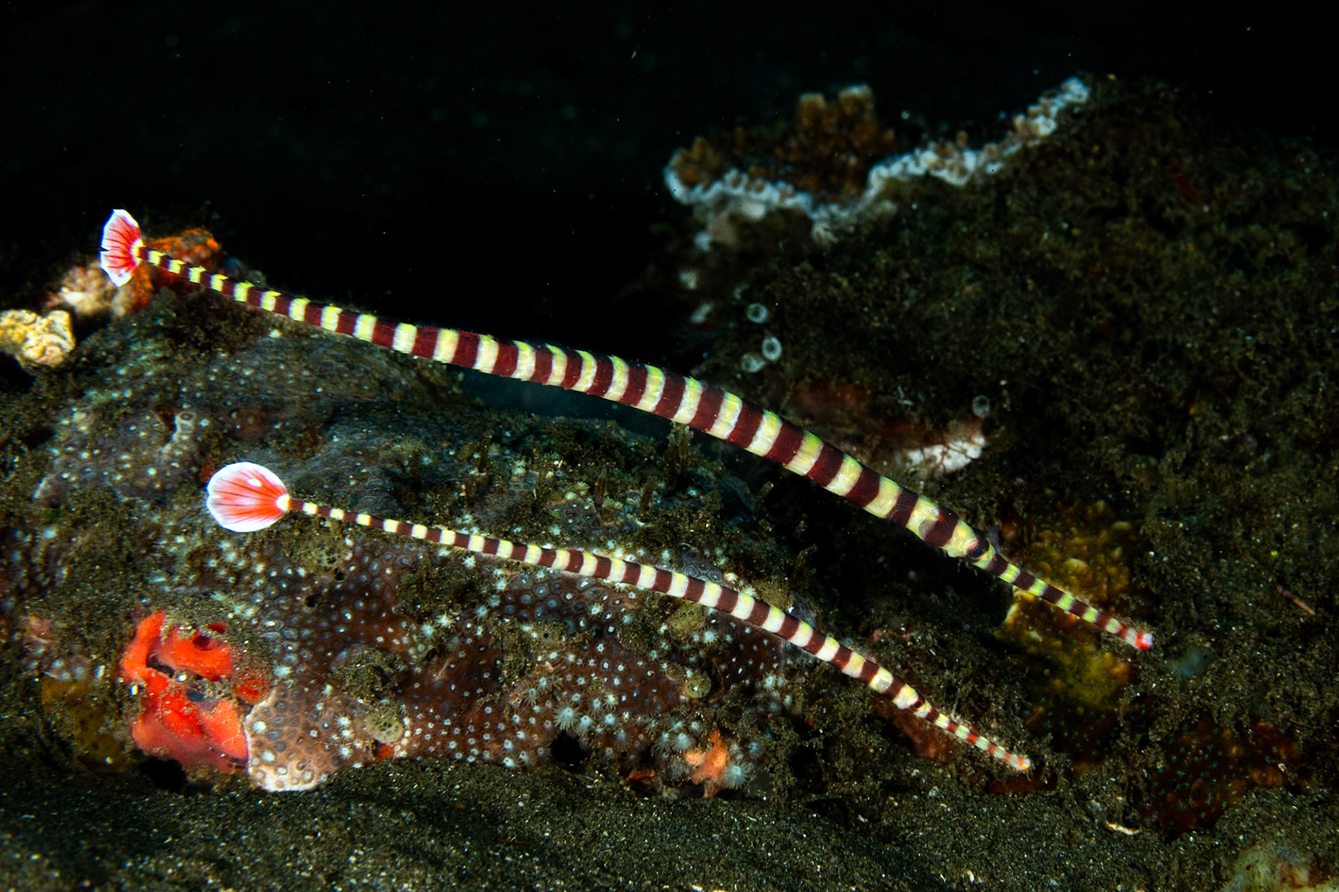 A pair of beautiful Rounghsnout Ghost Pipefish. Dumaguete, Philippines, July 2023. the female in teh foreground has a sack full eggs on the her belly.