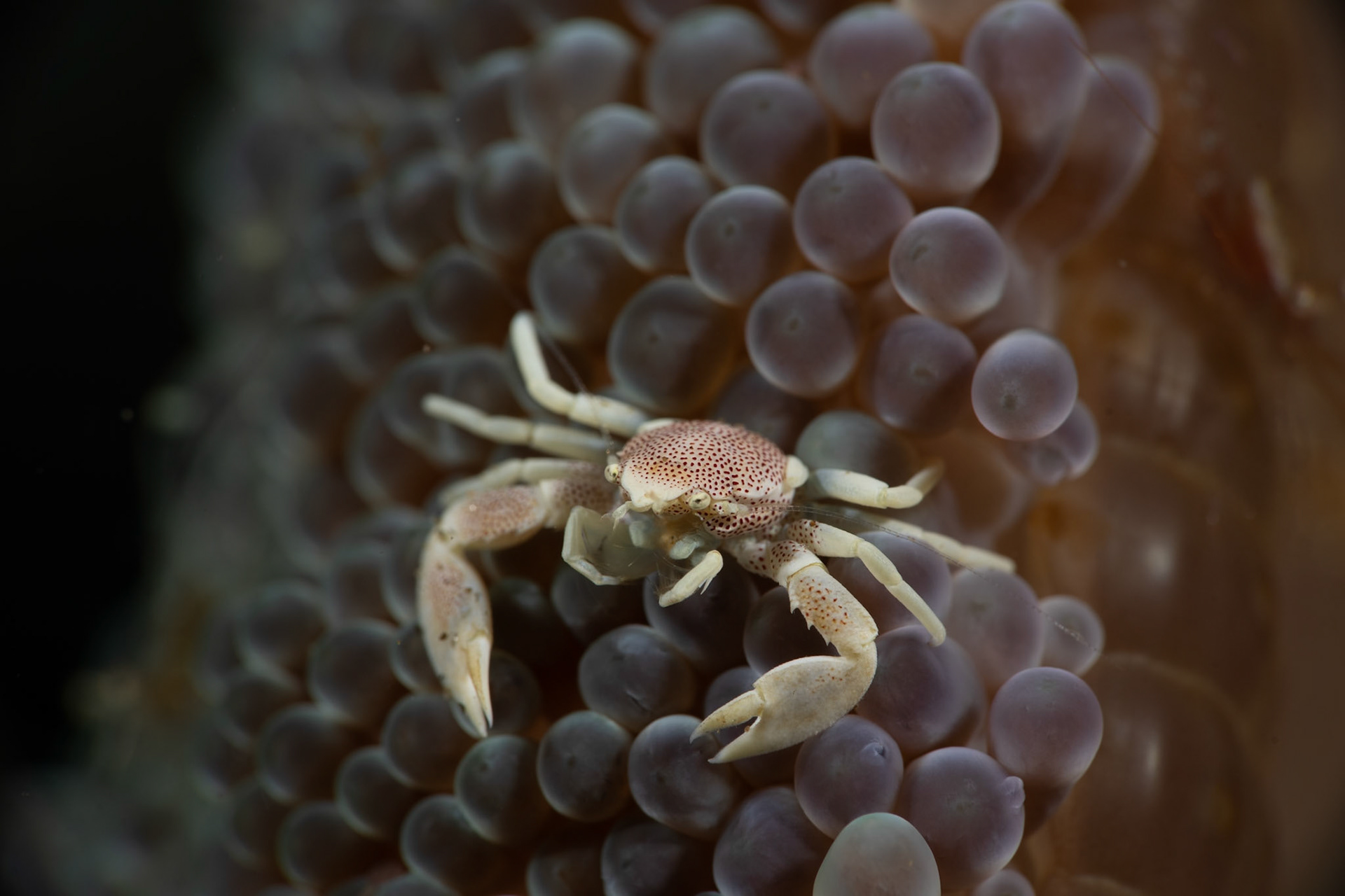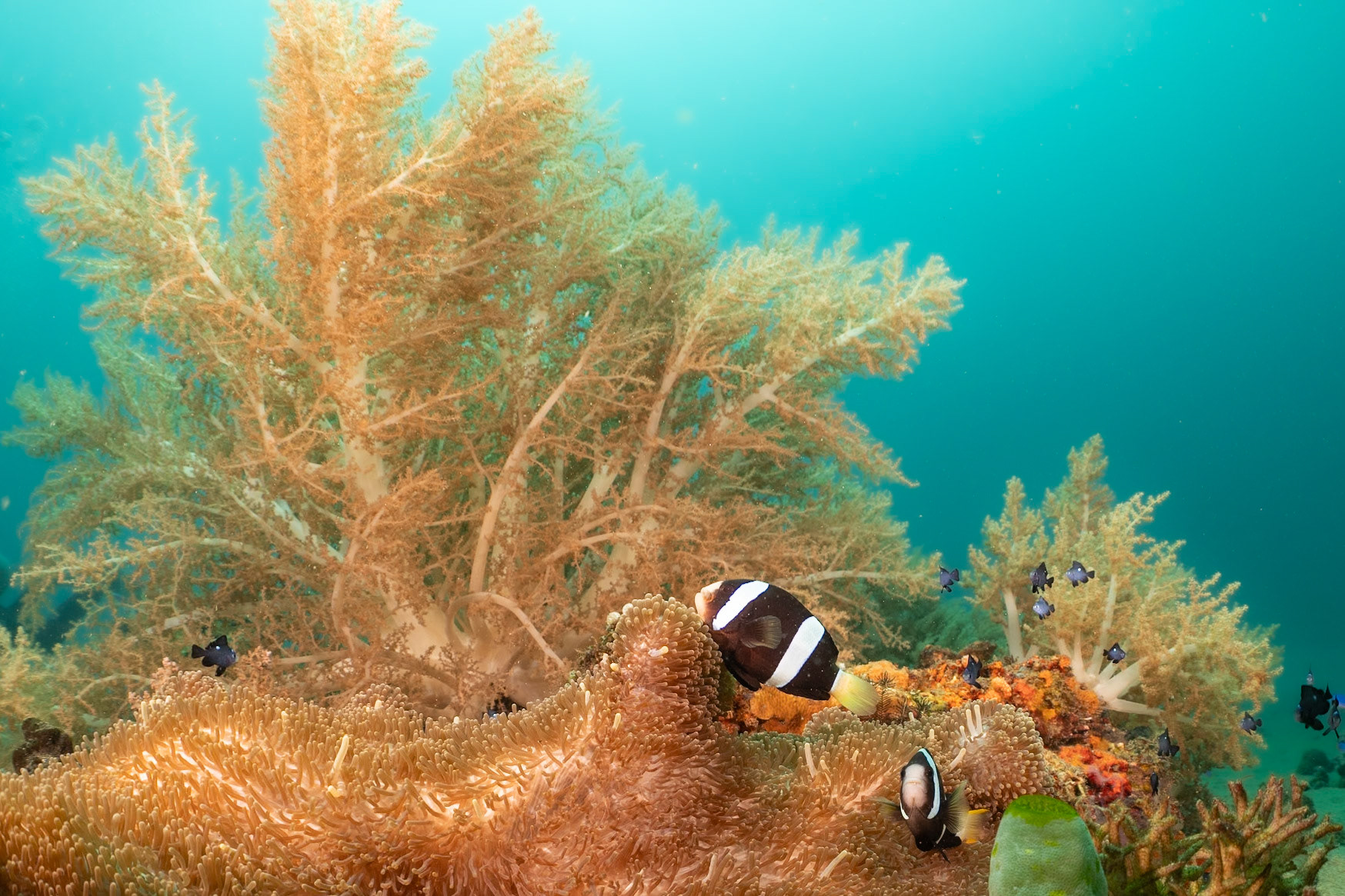 Anemonefish nestled in host Anemone. Dumaguete, Philippines. July 2023