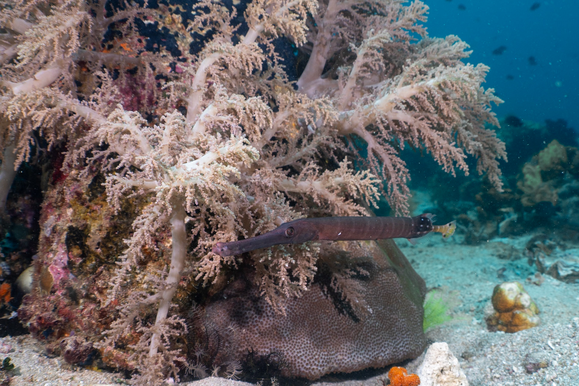 Amale Ornate Pipefidh (vertical with head pointing down) hoovering near his matching Crinoid. A Parrotfish is looking on.