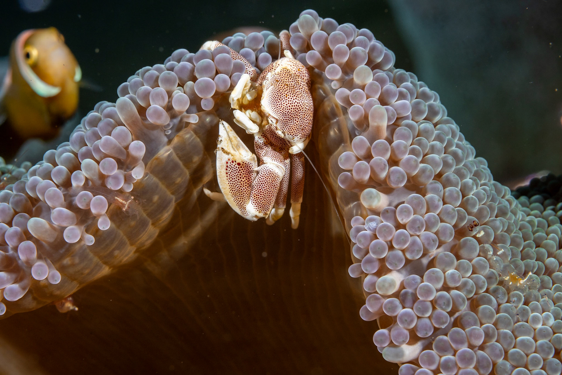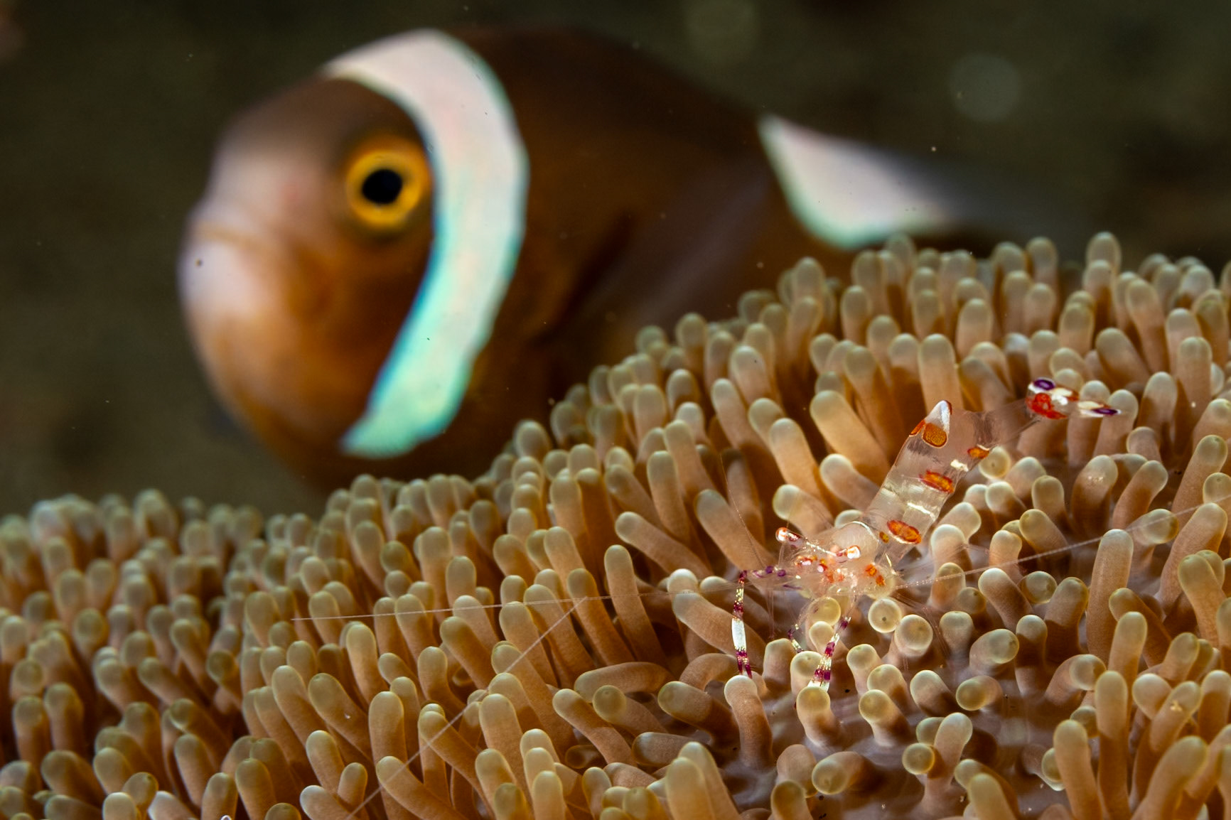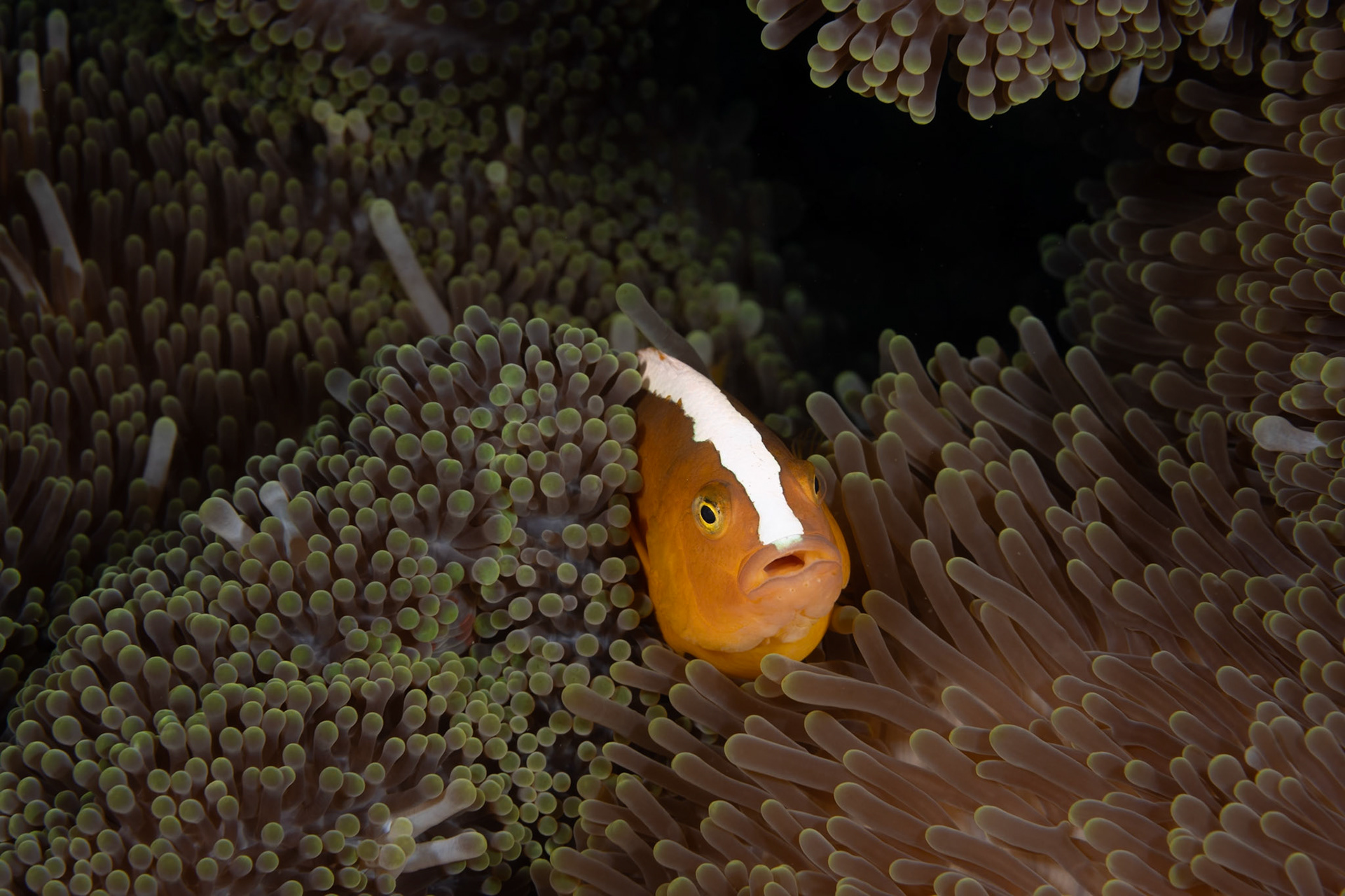A lovely portrait of an Orange Anemonefish peering out from her host Anemone. The Orange Anemonefish is distinguished by white stripe extending to upper lip.
